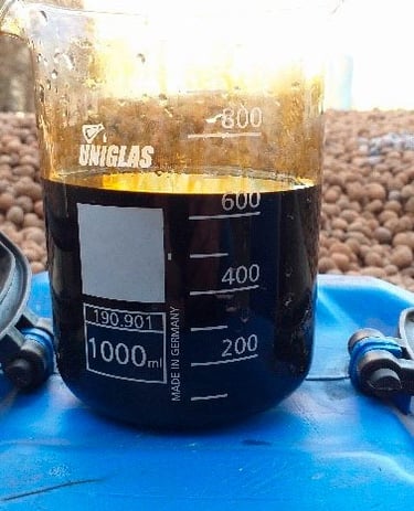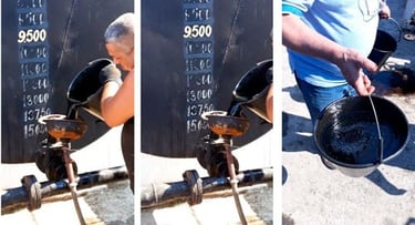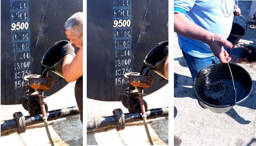 Como o óleo possui uma densidade menor que da água, a tendência do mesmo é permanecer na parte de cima do recipiente recebido, sem que haja mistura com a água existente no efluente. Foram feitos furos na parte de baixo dos tambores recebidos, para que pudéssemos coletar somente a água oleosa (efluente a ser tratado), sem coletar o óleo bruto presente na amostra.