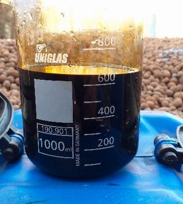 Após a separação da água oleosa do óleo bruto, percebemos a taxa de 45% de óleo bruto para 55% de água contaminada, o qual foi segregado da amostra a ser tratada, como mostra a figura ao lado.